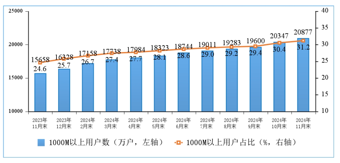 据中商情报网消息,2024 年 11 月末,我国千兆宽带用户达 2.09 亿户,比上年末净增 4549 万户,占总用户数的 31.2%,占比较上年末提升 5.5 个百分点 。在高速率用户持续增长拉动下,家庭户均接入带宽达 515.3Mbps / 户,同比增长 15.1%.